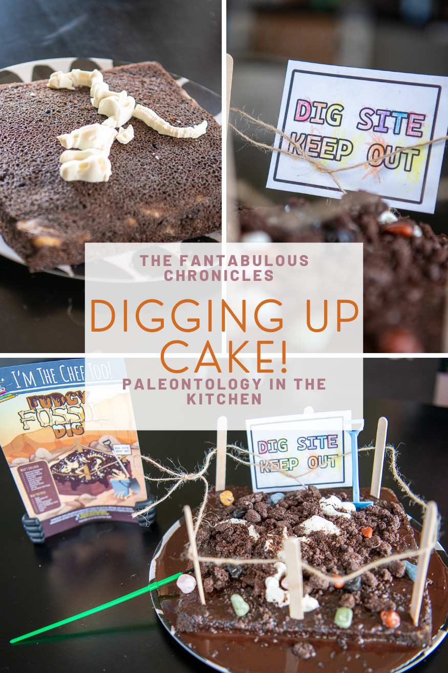 The cake was out of the oven and cooled, the dinosaur (named pretzel) was ready to pop out of the mold, and the dig site sign was colored. We were ready to build a fossil site!