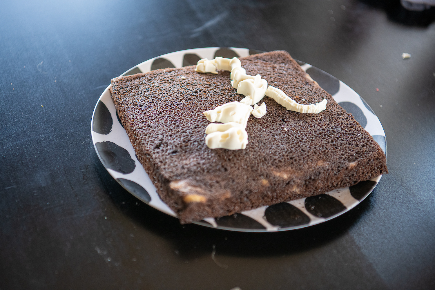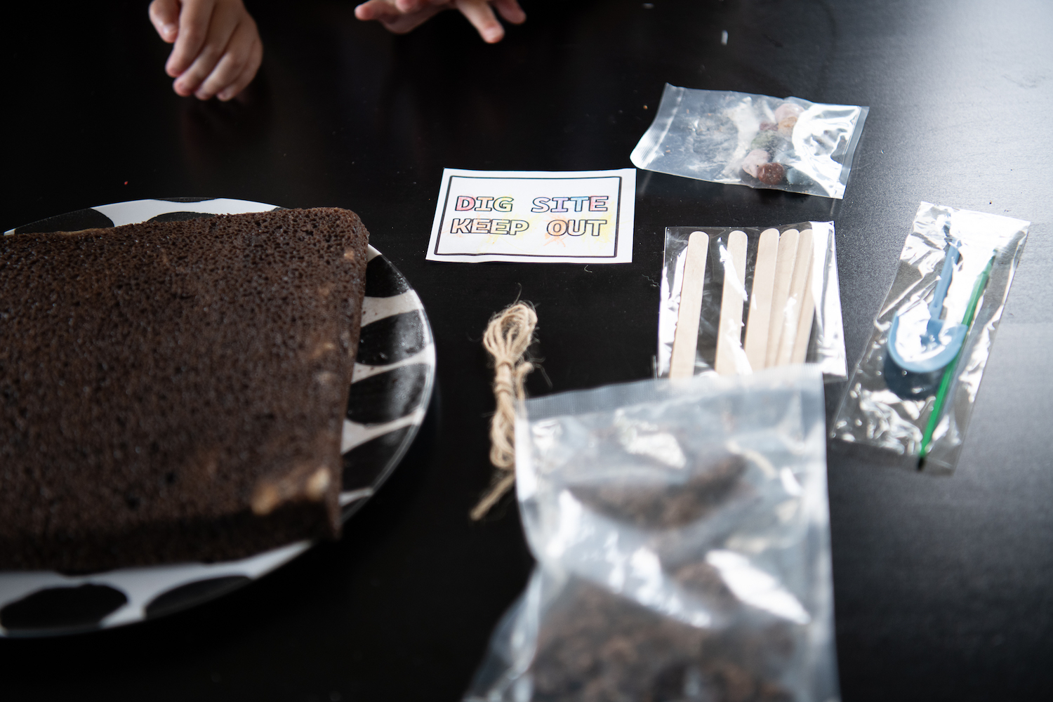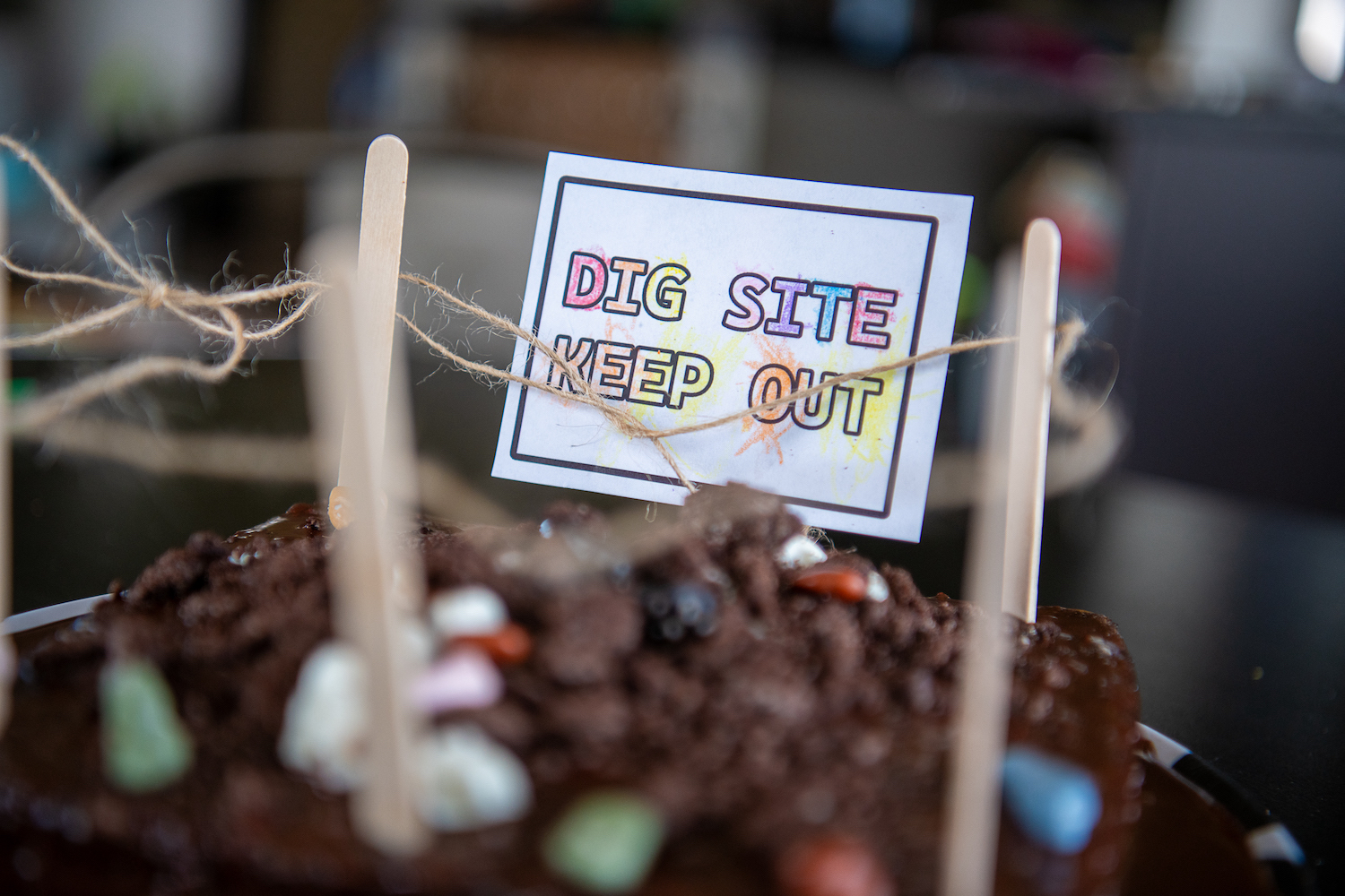 This is where it got a bit crazy. I had one child banging the bag of “dirt”, one trying to pop out the dinosaur ( imagine a white chocolate mini explosion) and the baby had the worst blowout ever all at the same time! Any other mamas relate? Needless to say everyone got cleaned up and we were ready to assemble when I realized we forgot to make the ganache. We followed the directions and it was super thin. I put it in the fridge and a few missing cake pieces later checked on it to find it hadn’t thickened at all. No problem, we always keep chocolate chips on hand! We added one handful….two handfuls…the third handful was my limit. Seriously who needs this much chocolate for ganache? It still wasn’t the thick luscious ganache I was expecting, but we weren’t going to have a cake left to decorate if we didn’t go with it. So pretzel took a nice mud bath before being covered in millennia of cookie dirt and candy rocks. Add in some craft stick fencing and a keep out sign and voila! Dig Site!