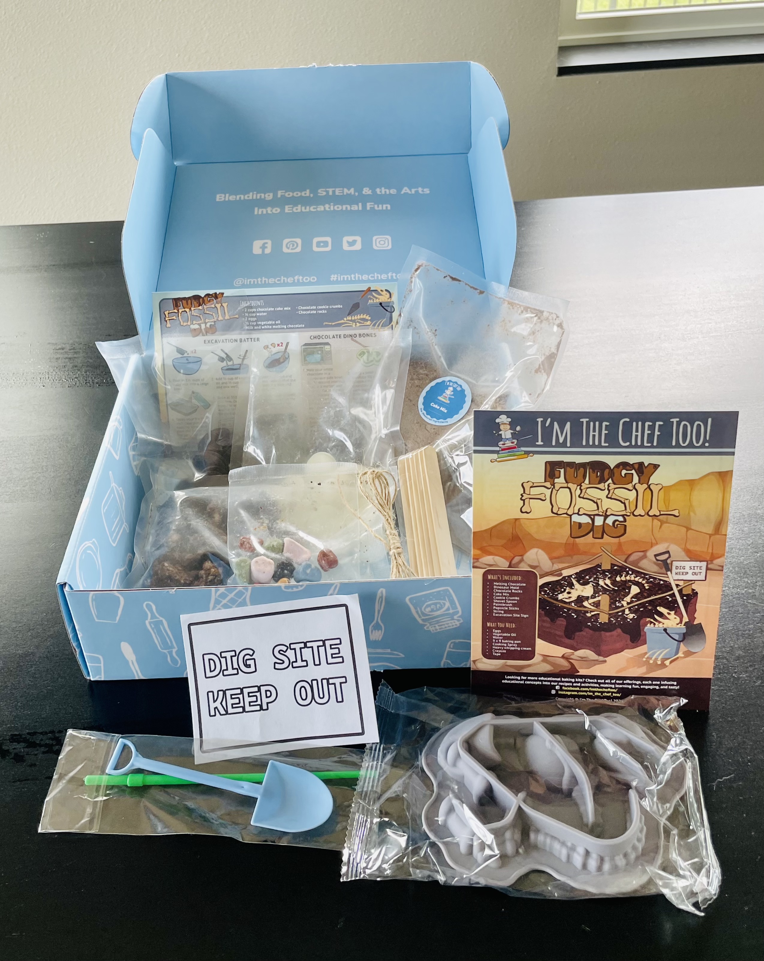 We have the 12 month subscription and it is always exciting to receive the blue box in the mail. This month we made a Fudgy Fossil Dig.